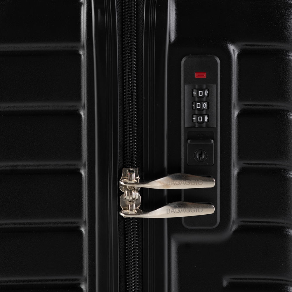 Cadeado com senha embutido O cadeado com senha vem embutido na mala. Nele, você cadastra uma senha numérica para prender os fechos e viajar com mais segurança.