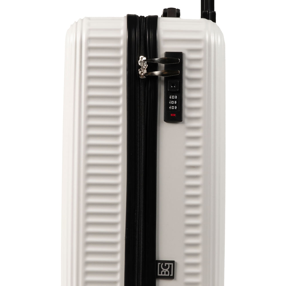 O cadeado com senha vem embutido na mala. Nele, você cadastra uma senha numérica para prender os fechos e viajar com mais segurança.