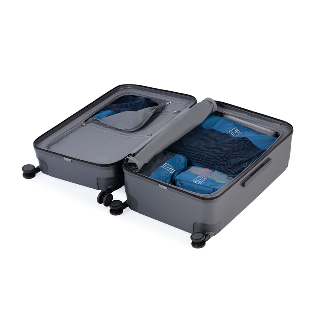 Conjunto de Malas Policarbonato 4 Rodas Bahamas P, M e G Cinza Escuro Chegou a mala dos sonhos para quem busca excelência. A mala Bahamas foi criada para ser a melhor opção para suas próximas viagens, construída com uma combinação de itens de alta qualidade fabricados por empresas referência no mercado. FEITA EM POLICARBONATO O modelo é construído com três camadas de policarbonato da empresa alemã Bayer. O policarbonato é o melhor material utilizado na construção de malas em todo o mundo, sendo altamente resistente, durável e leve. ZÍPER E RODAS DE REFERÊNCIA A mala conta com zíper da japonesa YKK, que tem cinco camadas de reforço para você no se preocupar se precisar “forçar” a mala com mais bagagem. São também mais suaves de usar. Já as rodas foram desenvolvidas pela empresa americana SJ. Tobol, com material de alta precisão. Elas são perfeitas para qualquer tipo de chão e estrada, possuem giro 360º e são silenciosas. ALÇA TELESCÓPICA E MAIS ESPAÇO INTERNO As alças principais são alocadas nos extremos da mala, para proporcionar mais espaço interno para sua bagagem. Além disso, são telescópicas, feias em alumínio resistente, antiferrugem e durável, com diferentes ajustes de tamanho para se encaixar à sua necessidade. O material interno é antibactericida de longa duração e pode eliminar até 99% das bactérias mais comuns. Ele no suja nos cantos e evita manchas no forro. ESPAÇO PARA ROUPA MOLHADA O espaço interno conta com compartimento de EVA para roupa molhada, além de diversos compartimentos para melhor organização da sua bagagem. DIFERENCIAIS: - 3 camadas de policarbonato da Bayer - Zíper com 5 camadas de reforço da empresa japonesa YKK - Rodas dupla silenciosas que giram 360º da empresa americana SJ. Tobol - Cadeado TSA - Alças alocadas nos extremos da mala, para mais espaço interno - Alça telescópica de alumínio resistente e antiferrugem - Alças duplas emborrachadas - Compartimentos internos - Bolso no interior para roupa molhada - Material interno antibactericida.