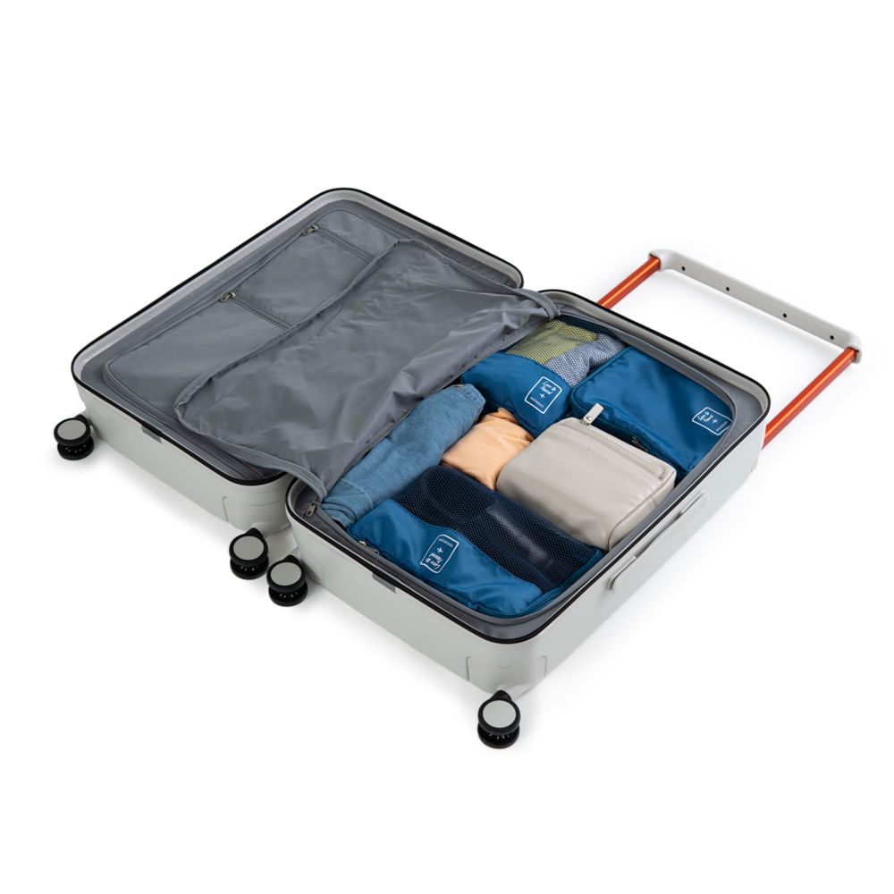 As 4 rodas duplas com giro 360° permitem movimentação suave em qualquer direção, tornando o transporte da sua bagagem muito mais simples.