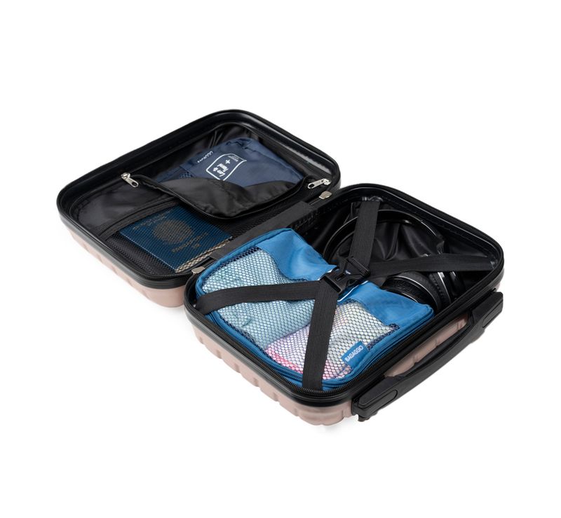 Divisórias internas com zíper e cintas elásticas para manter seus objetos no lugar. Ideal para cosméticos, acessórios, produtos de higiene pessoal ou roupas.