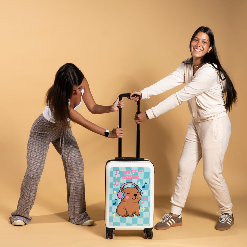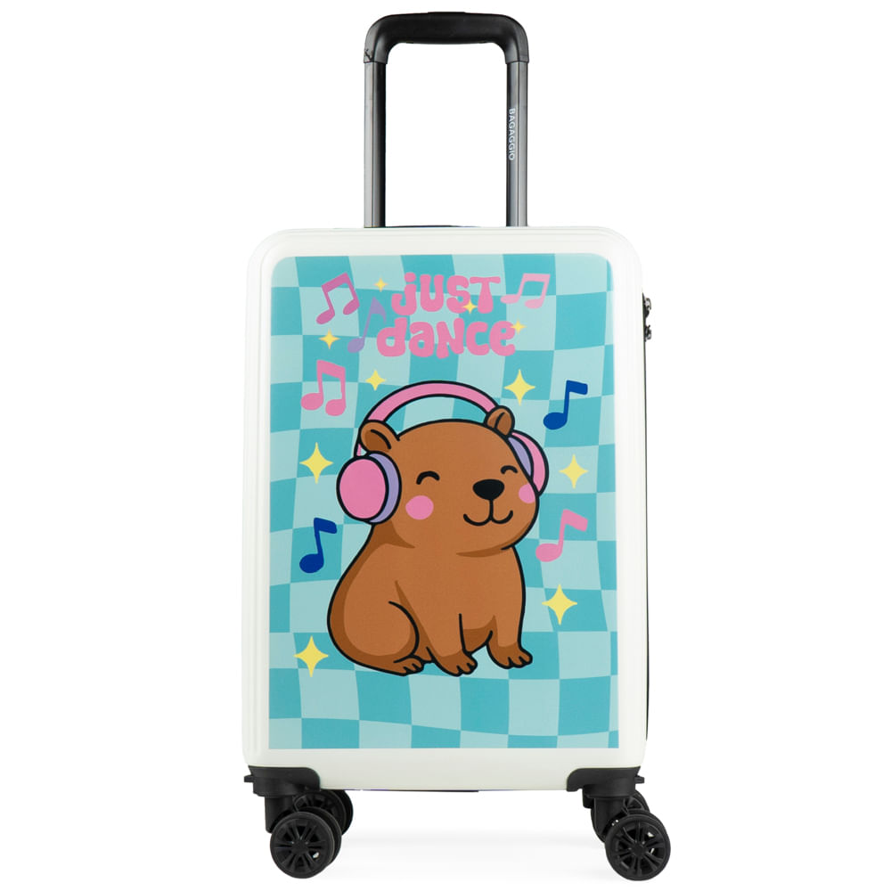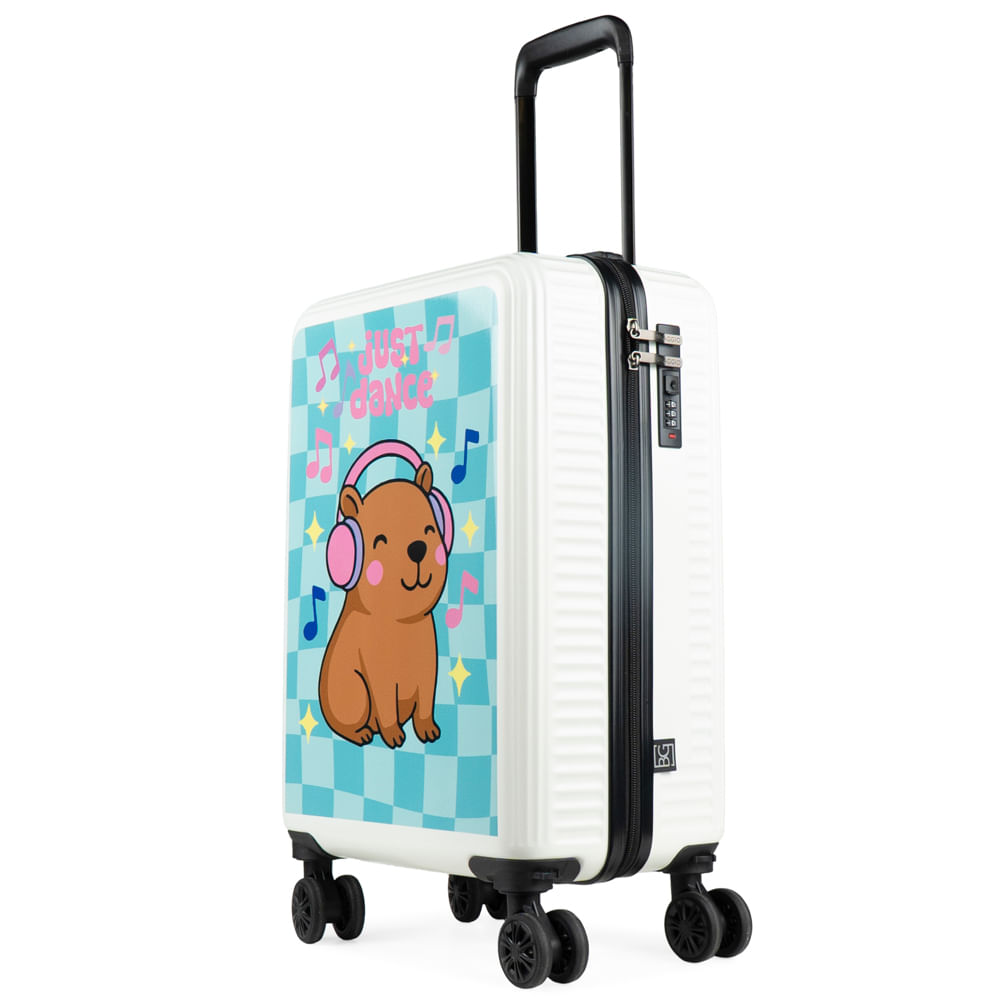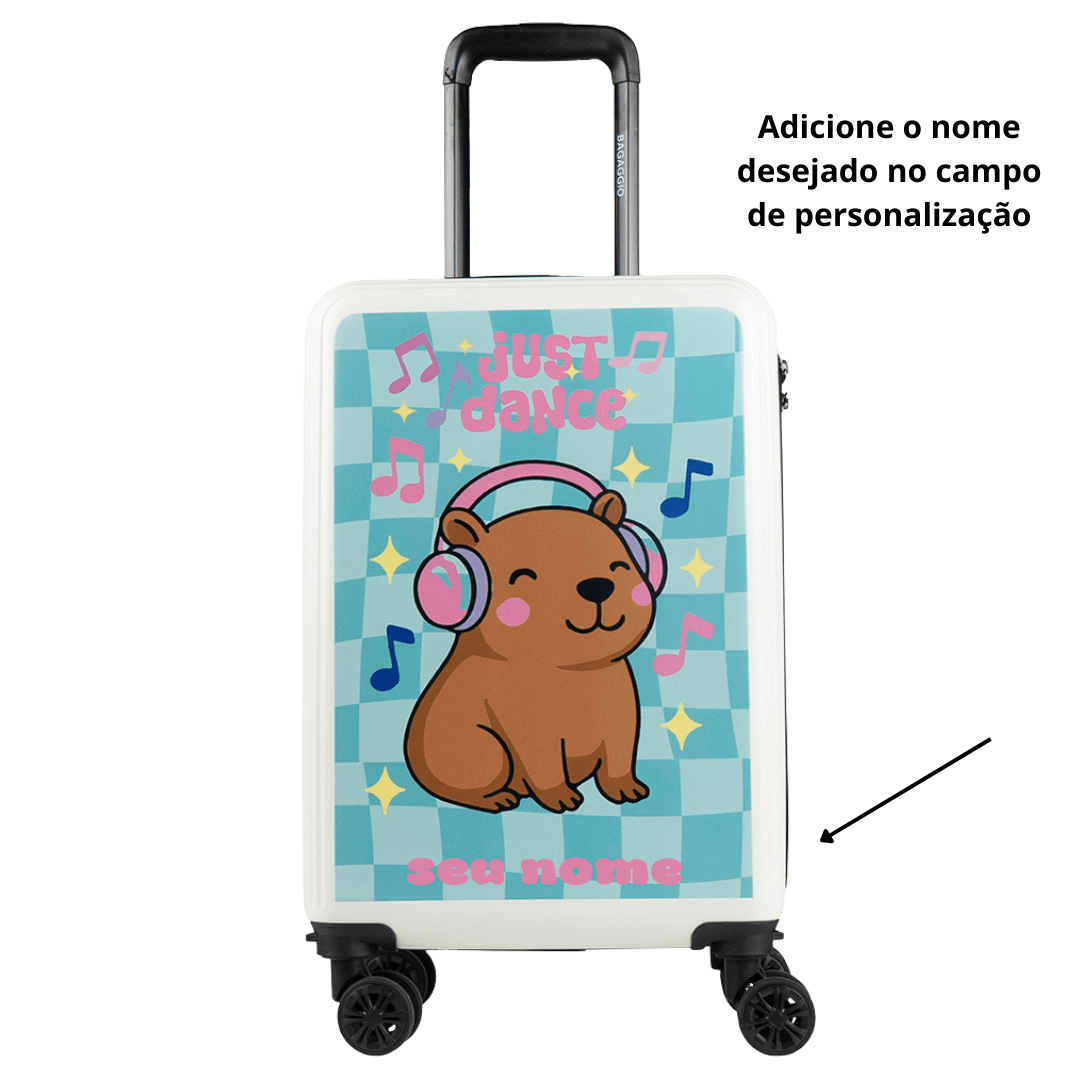 Leve a simpatia do animal mais querido da internet para suas viagens com a Mala de Viagem Personalizada Capivara. Com um design super divertido e moderno, ela apresenta uma estampa exclusiva de uma capivara ouvindo música sobre um fundo xadrez colorido, perfeita para quem tem um estilo jovem e descontraído. Esta mala de bordo rígida oferece máxima proteção para seus pertences e conta com 4 rodas duplas 360º para um transporte leve e ágil. Além disso, possui cadeado com segredo integrado na lateral e um interior inteligente com divisórias com zíper e cintas elásticas. É a escolha ideal para quem busca uma mala criativa e cheia de personalidade.