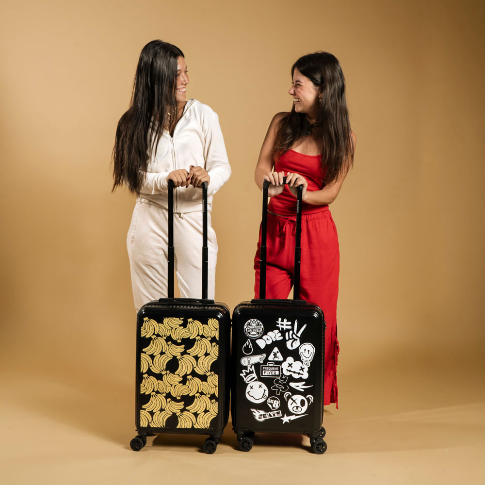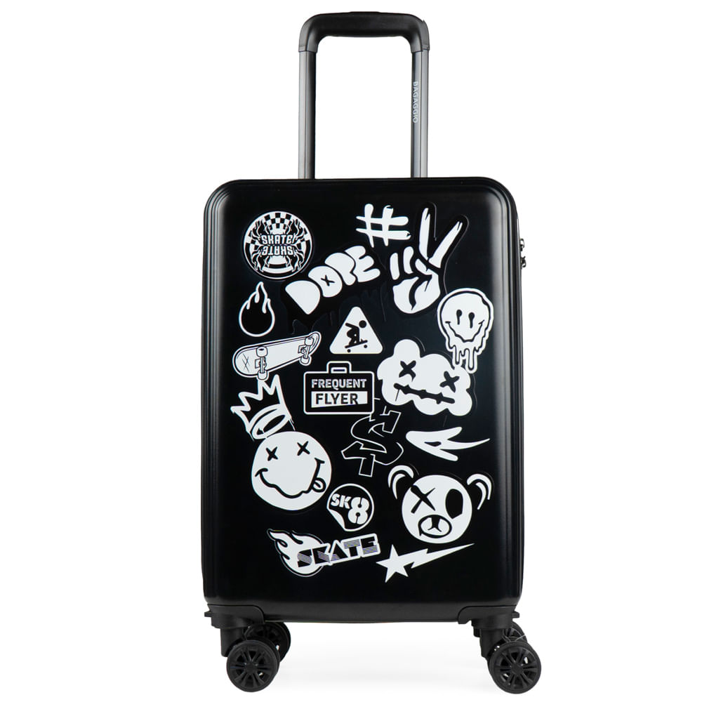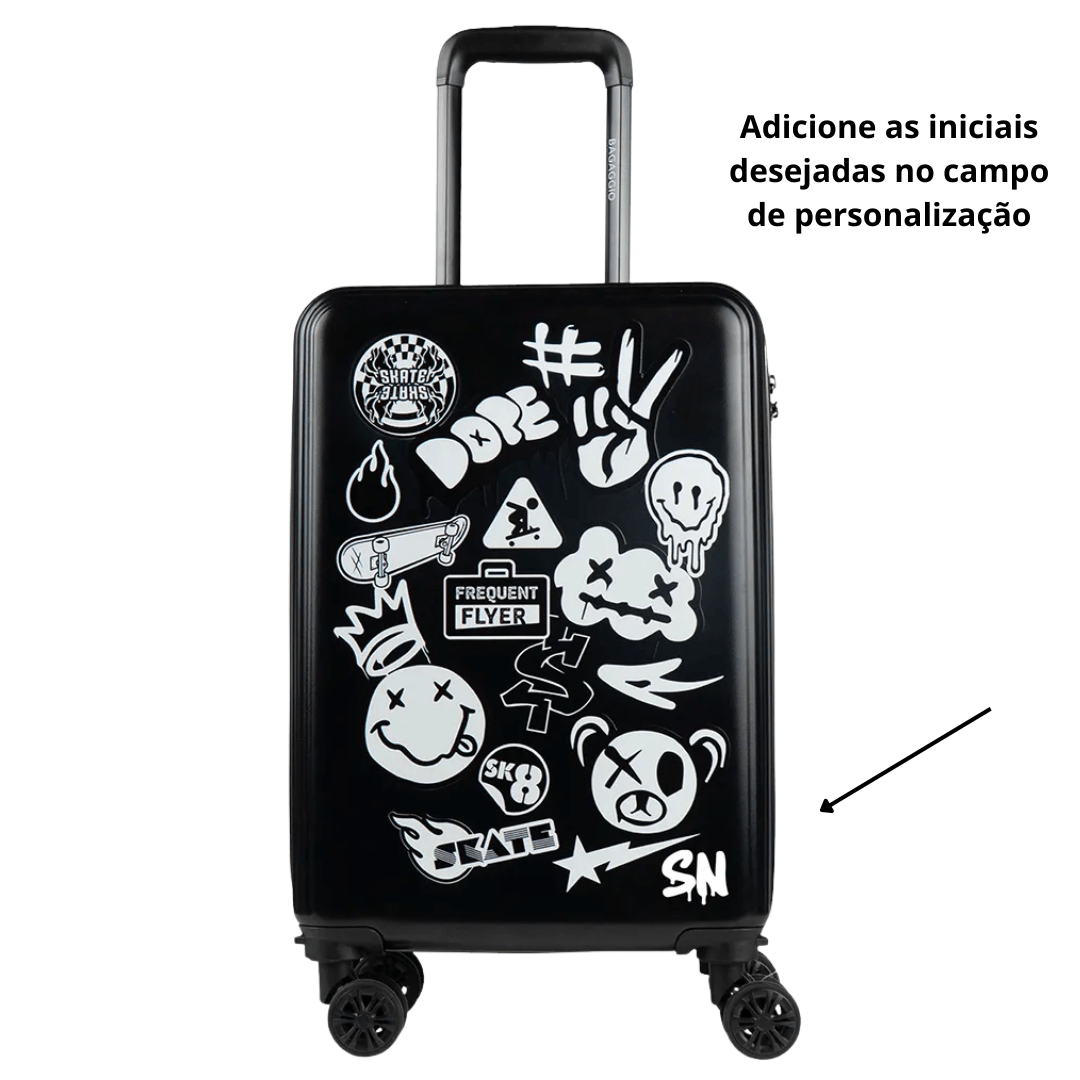 Mostre toda a sua atitude com a Mala de Viagem Personalizada Stickers.. Com um visual urbano e cheio de personalidade, esta mala preta destaca uma estampa exclusiva estilo "colagem" com ícones de skate, smileys, grafites e lettering streetwear, perfeita para quem curte um estilo jovem e despojado. Além do design arrojado, é uma mala de bordo rígida e resistente, equipada com 4 rodas 360º que garantem mobilidade total e um puxador retrátil ergonômico. Seu interior espaçoso mantém tudo organizado, unindo a funcionalidade de uma bagagem de alta qualidade com um visual que se destaca na multidão.