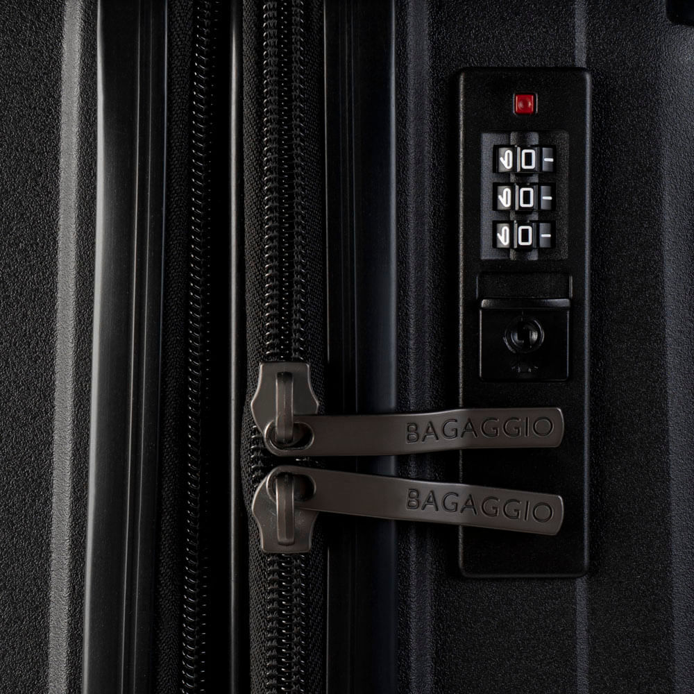Cadeado com senha embutido O cadeado com senha vem embutido na mala. Nele, você cadastra uma senha numérica para prender os fechos e viajar com mais segurança.