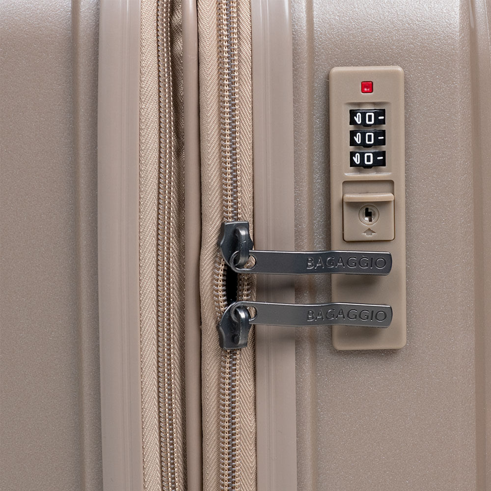 Cadeado com senha embutido O cadeado com senha vem embutido na mala. Nele, você cadastra uma senha numérica para prender os fechos e viajar com mais segurança.