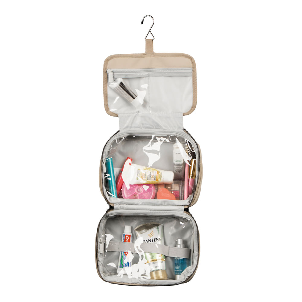 Outro ponto de destaque é o gancho para pendurar, que torna a utilização ainda mais confortável. Esse recurso permite deixar a nécessaire suspensa e aberta, facilitando o acesso aos itens e ajudando na organização em ambientes com pouco espaço.