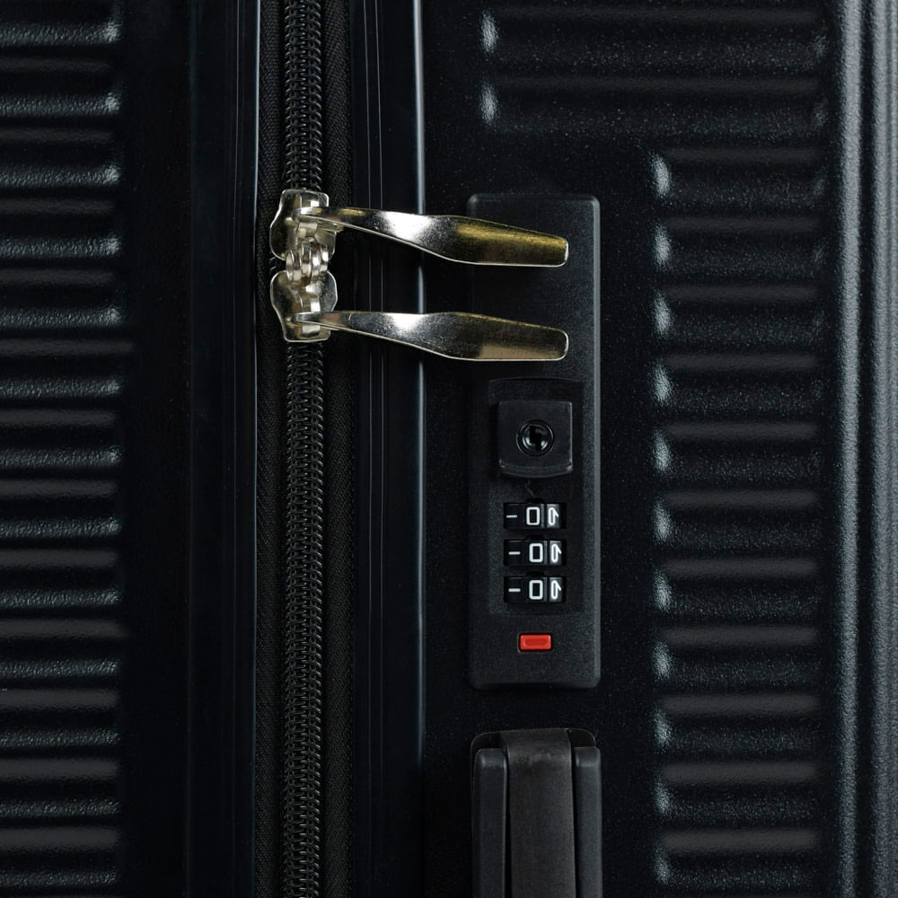 O cadeado com senha vem embutido na mala. Nele, você cadastra uma senha numérica para prender os fechos e viajar com mais segurança.